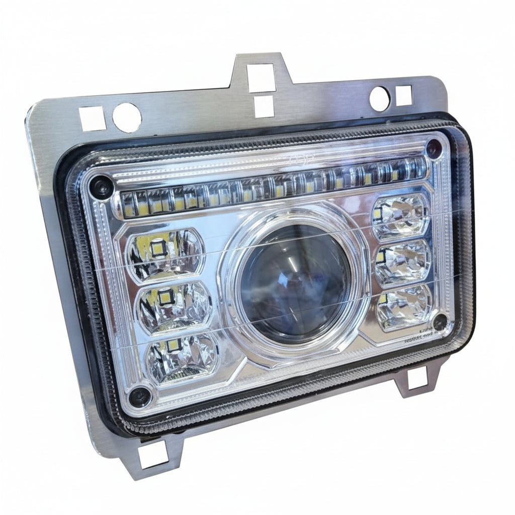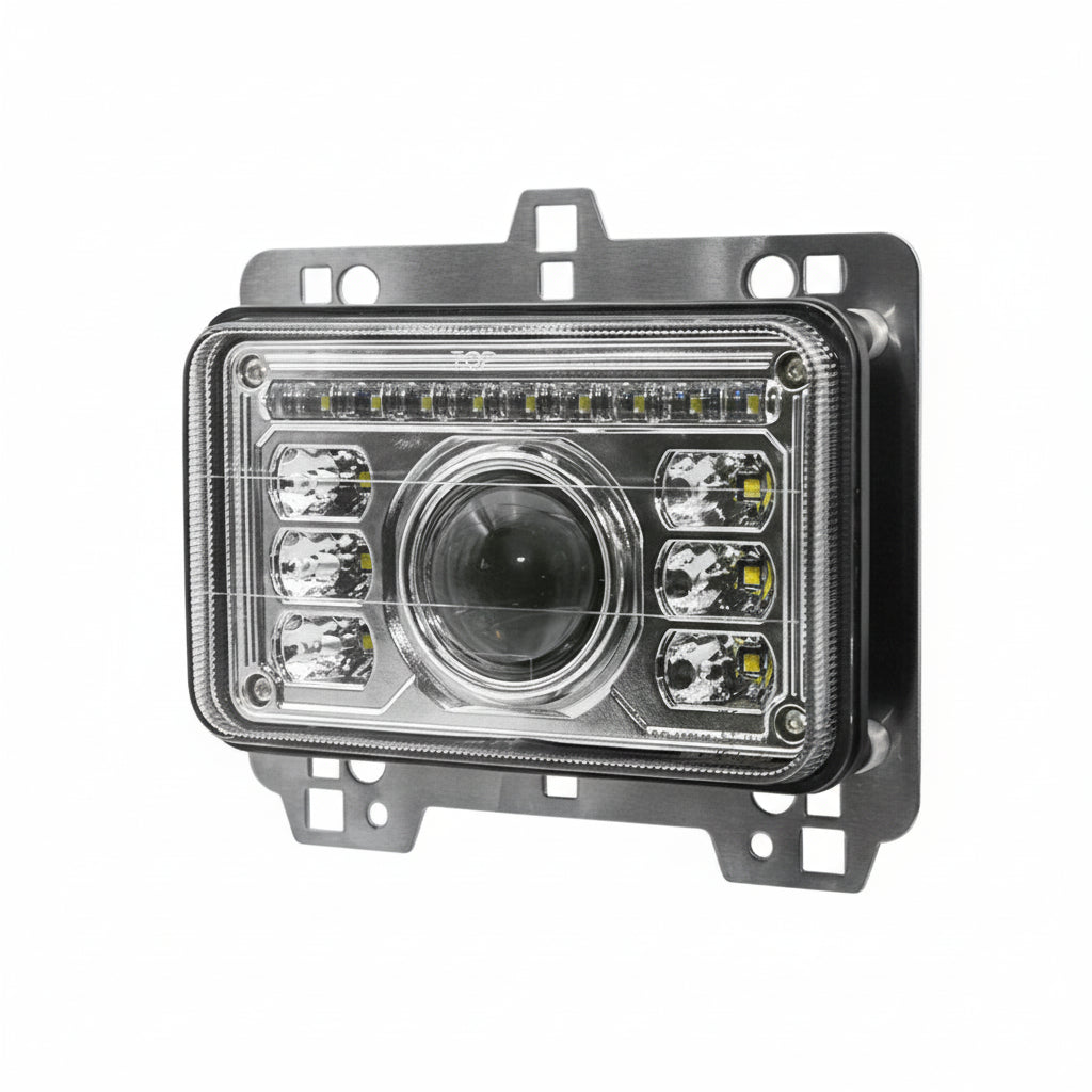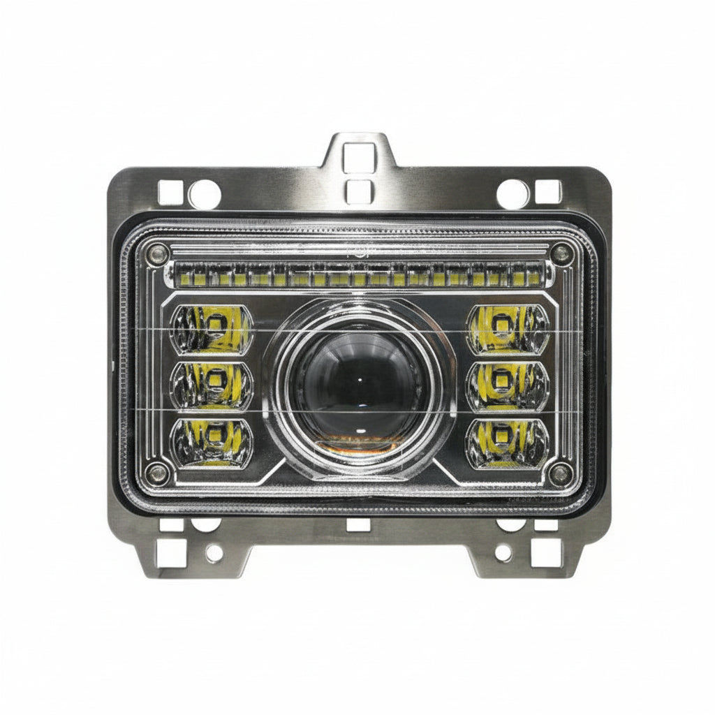 Electrically, it’s designed for mixed fleets. The 9 – 32 V DC input covers 12 V and 24 V systems, and the integrated H4 connector makes it essentially a straight swap for many existing halogen units. No ballast boxes. No adapters on most installs. Just a clean plug-in replacement that draws less power for more usable light. That’s especially handy on older machines with tired alternators or packed electrical harnesses.