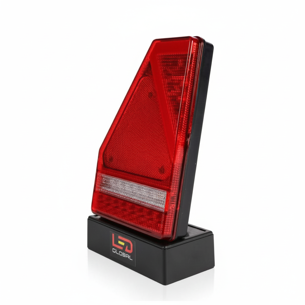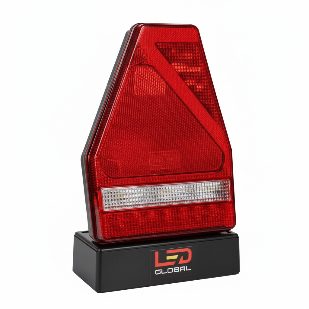 - Full triangular combination lamp (RH) – integrates stop, tail, indicator, fog, reverse, reflector and ECE triangle in one compact right-hand unit.