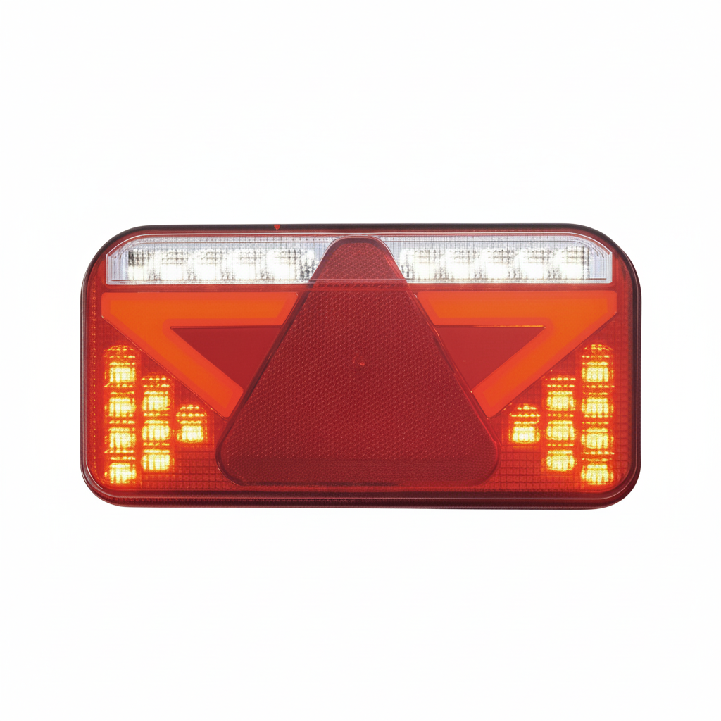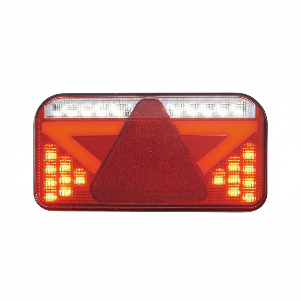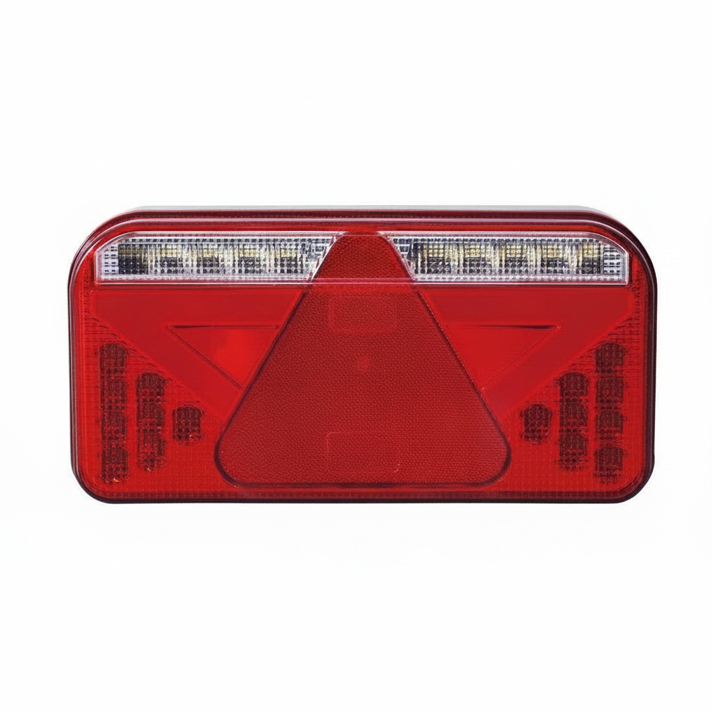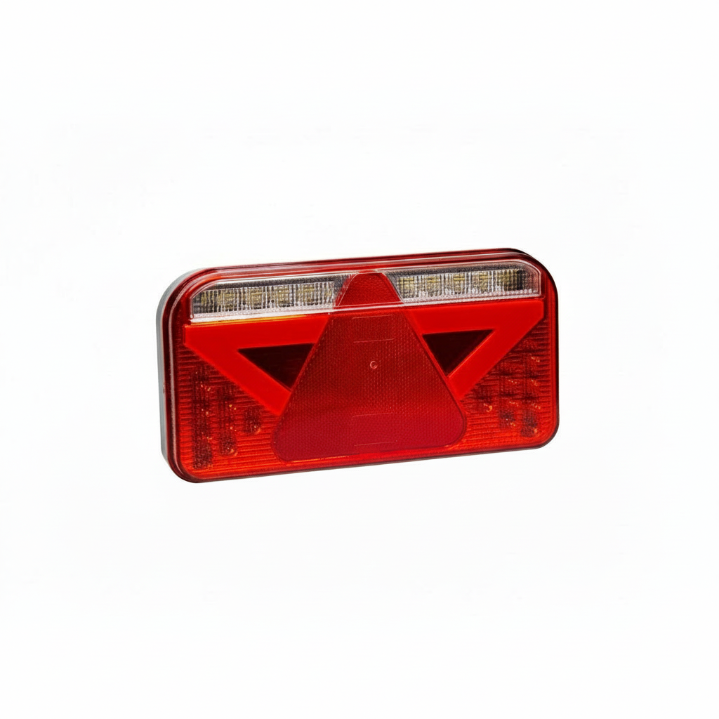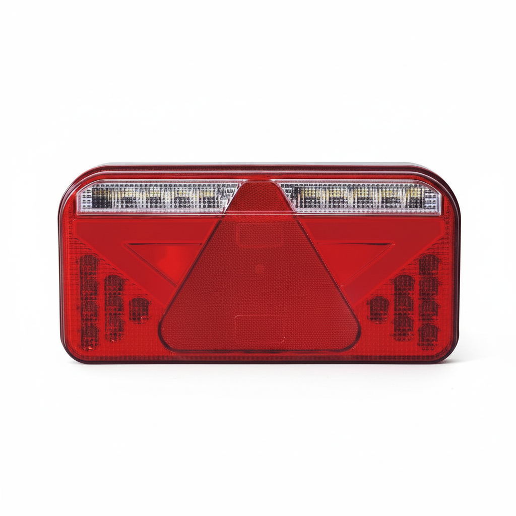 This left-hand LED tail light packs seven functions into a footprint of 256 × 130 × 40.5 mm, including the mandatory rear red triangle reflector for trailers. You get stop, tail, indicator, fog, reverse and reflector, plus the triangle, in a single robust housing. Light output is crisp and controlled: amber indicators, deep red stop/tail, and a 6000 K white reverse beam that gives clear visibility when backing into tight yards or unlit loading bays.