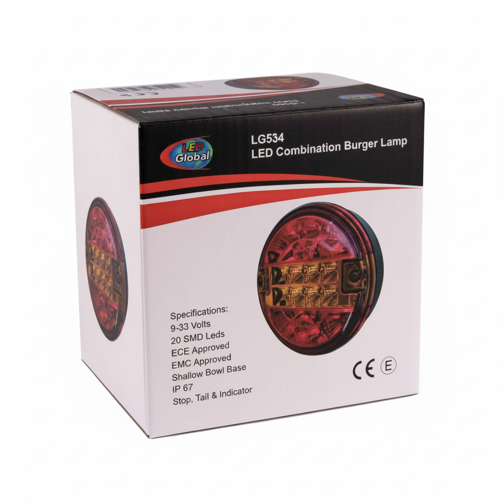 Die LED-Rücklicht Burger-Kombination LG534 ist eine kompakte, schlanke Rückleuchte, die Bremse, Rücklicht und Blinker in einem ordentlichen Gehäuse vereint. Entwickelt für 9–33 V Systeme, eignet sie sich für gemischte Fuhrparks mit 12 V und 24 V. Mit ECE R10, R6 und R7 Zulassungen sowie CISPR25 Klasse 3 EMV-Leistung ist sie eine bewährte, straßentaugliche Wahl für professionelle Einbauten.